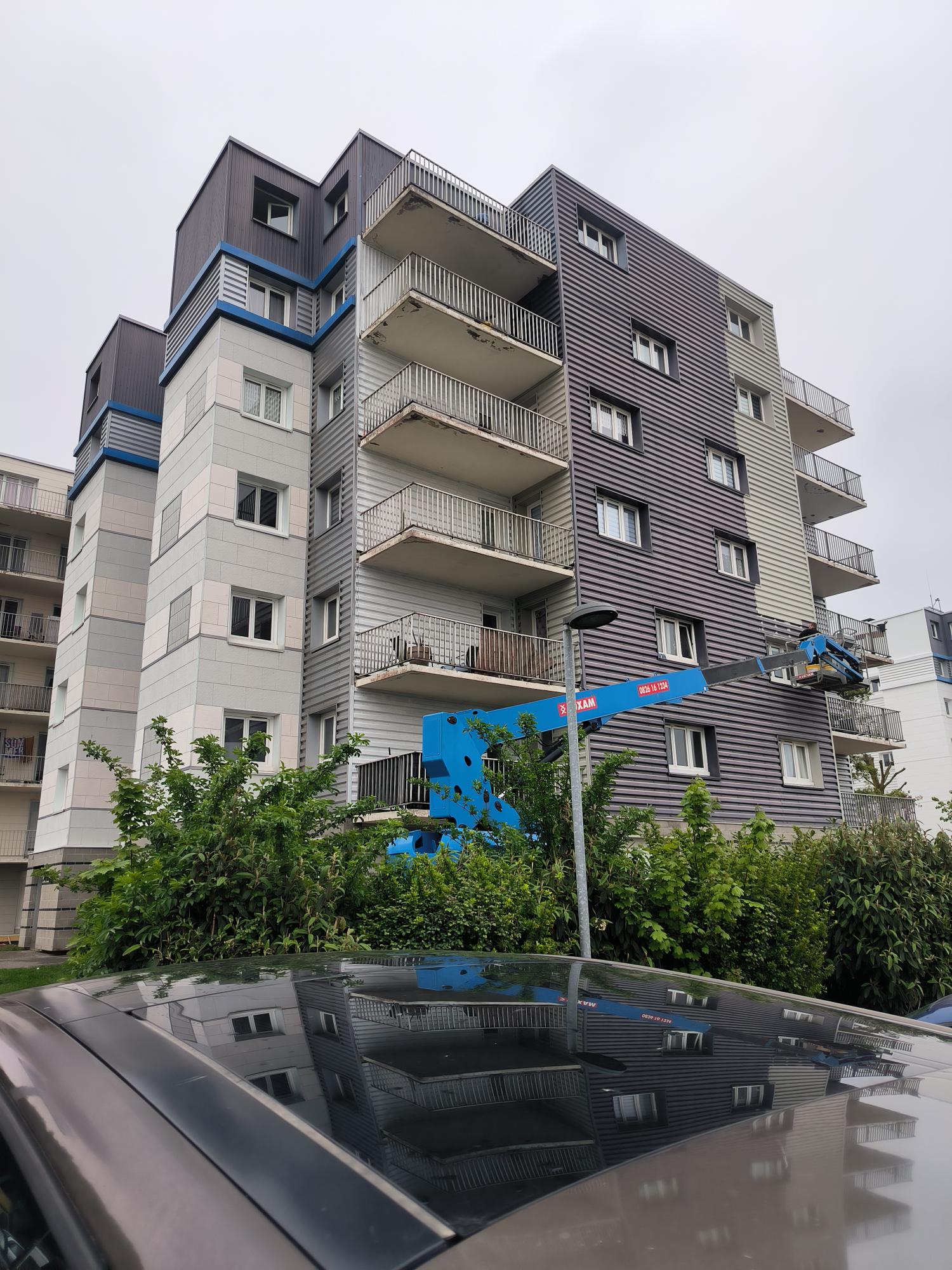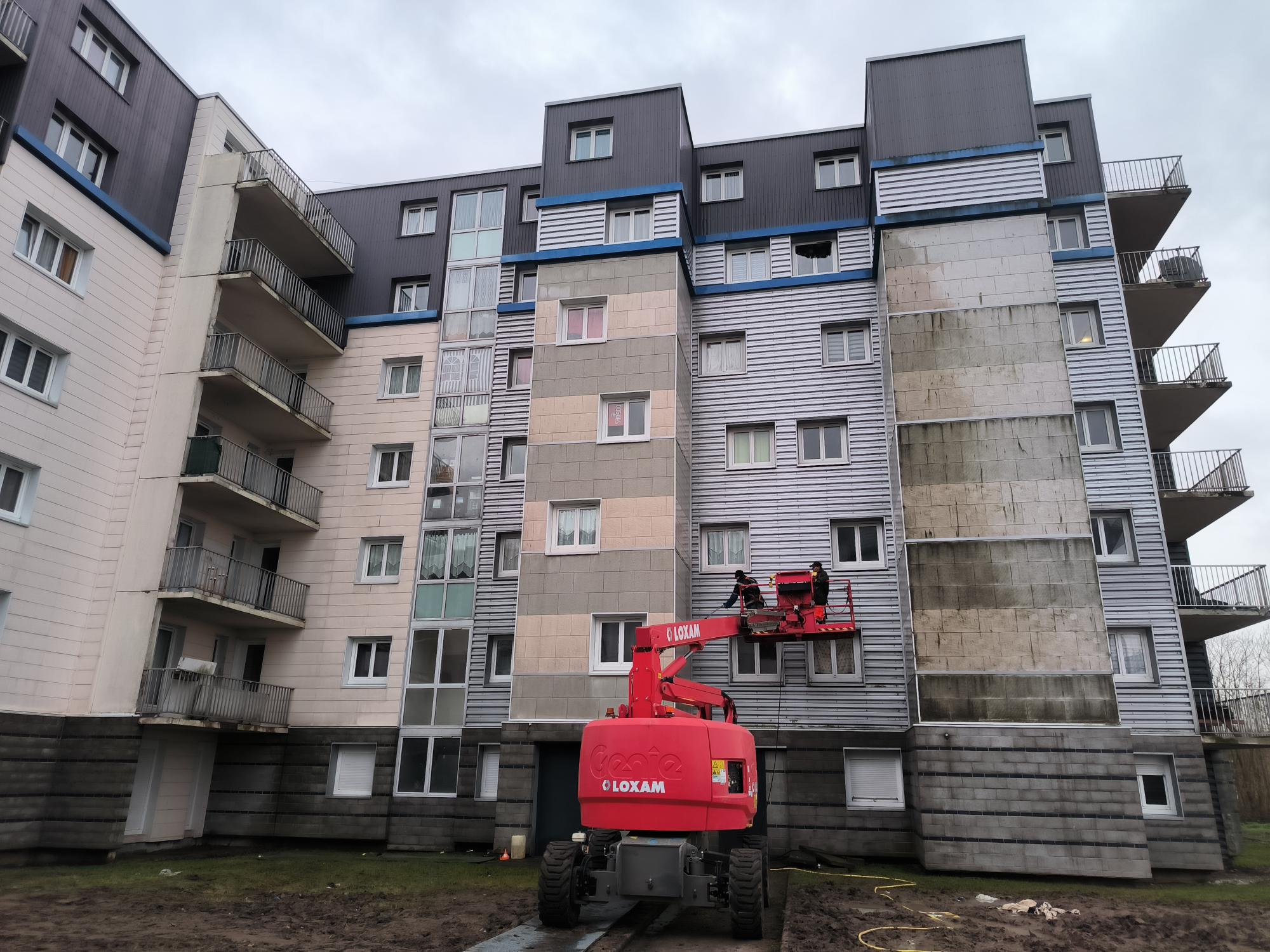 Le projet de rénovation de la résidence Omer Ollivier appartenant à Lille Métropole Habit à La Chapelle d’Armentières a été lancé en janvier 2025 pour les travaux de l’enveloppe du bâtiment. FlyRenov a été retenu pour réaliser les travaux de nettoyage et de remise en peinture des façades. Ce chantier d’envergure se déroule en coordination avec trois autres corps de métier – maçonnerie, VRD et serrurerie afin de transformer en profondeur l’aspect de la résidence et de ses abords. Les travaux visent également à la sécurisation des balcons et à l’amélioration du confort d’été en améliorant l’albédo des façades.